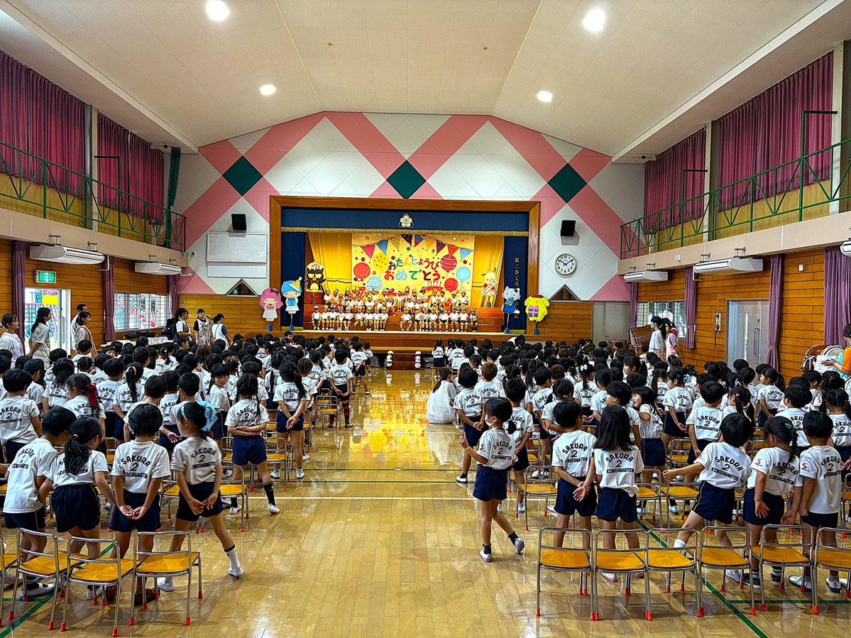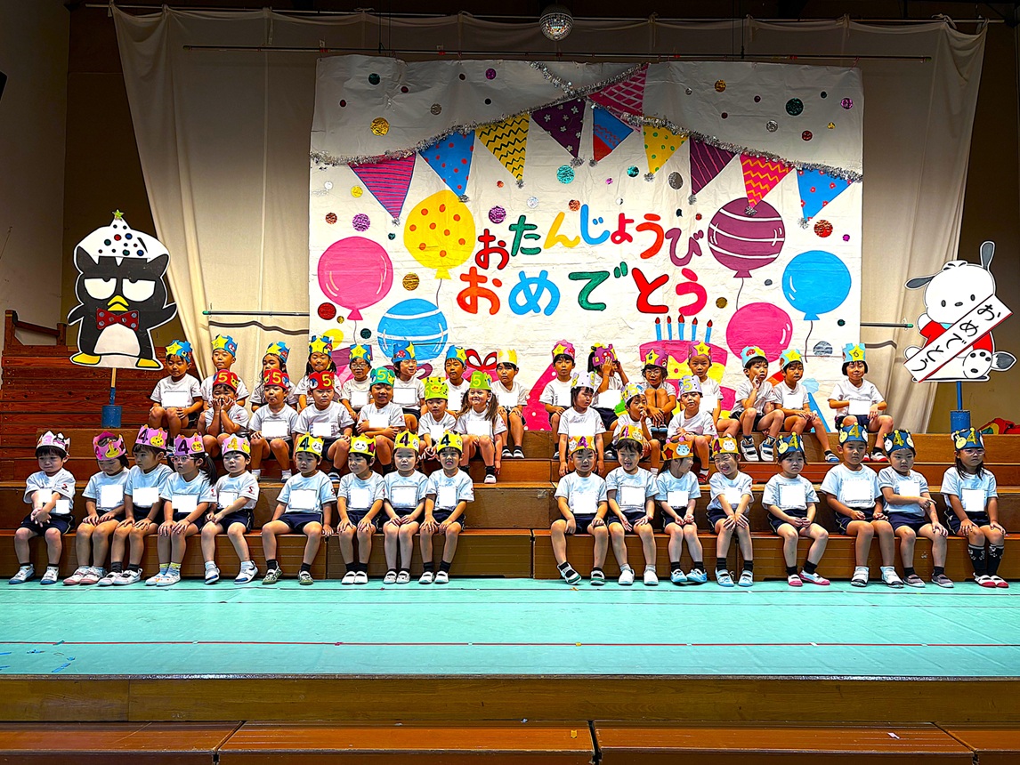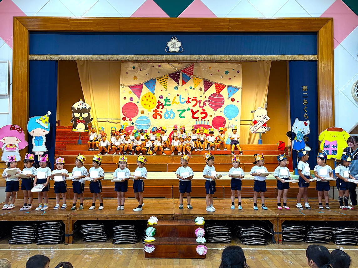 2025.10.06 お知らせ 10月誕生会 お誕生日おめでとう!! 10月3日に10月生まれのお友だちの誕生会を行いました。お友だちからの歌や、プレゼントを貰って喜ぶ可愛い笑顔が見られ、先生たちからの出し物もあり、楽しい誕生会になりました(^^♪10月生まれのお友だち、誕生日おめでとう!! ~誕生会の様子~